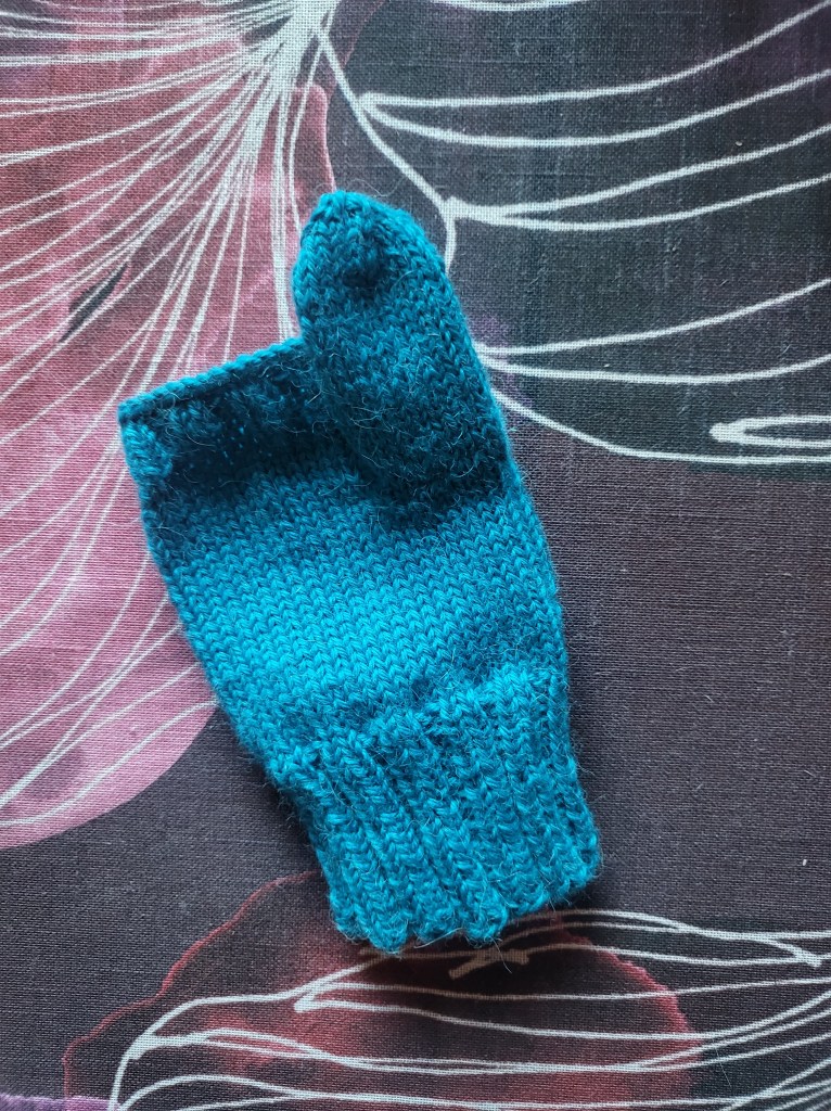 Lopetin päättelyn kun silmukoita oli jäljellä 44 per lahje. Tein lopulta 20 kerrosta 2o, 2n-joustinta lahkeiden suihin ja päättelin joustavasti 3,5 mm pyöröillä.