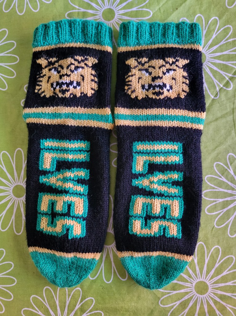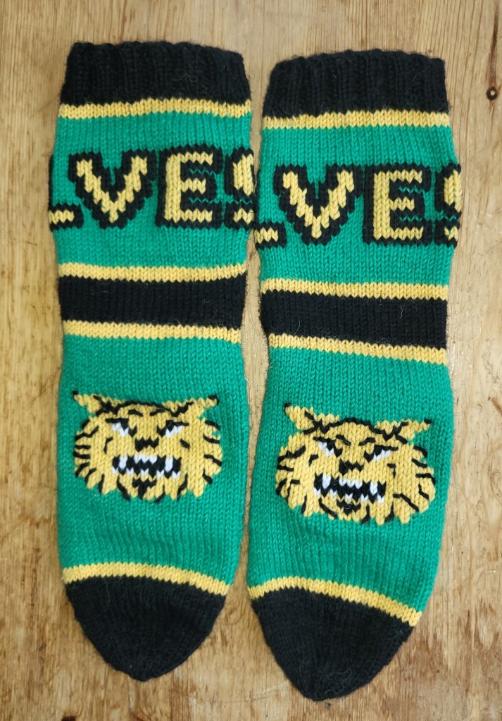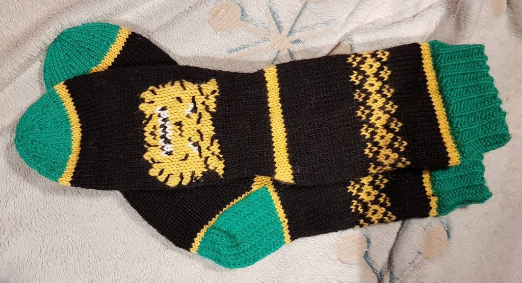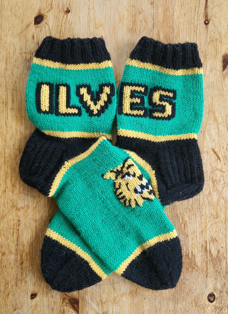 Jännästi valo muuttaa väriä, oikeasti nämä on kunnon vihreät. Mutta niin, tulipa sitten muutamien Tapparoiden jälkeen touhuttua vaihteeksi yhdet Ilveksenkin sukat. Halusin hieman enemmän sukkiin näköä, joten tein logon jalkapöytään ja tekstin varteen. Ei hassumpaa.