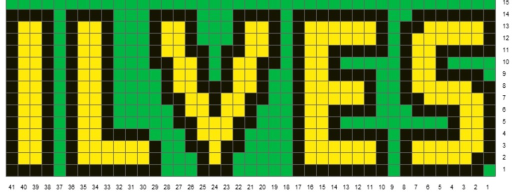 Kudottuani pelkällä mustalla 15 kerrosta otin mukaan myös keltaisen ja kudoin mallikaavion mukaan ilveksen ja jalkapohjan palkituksen.