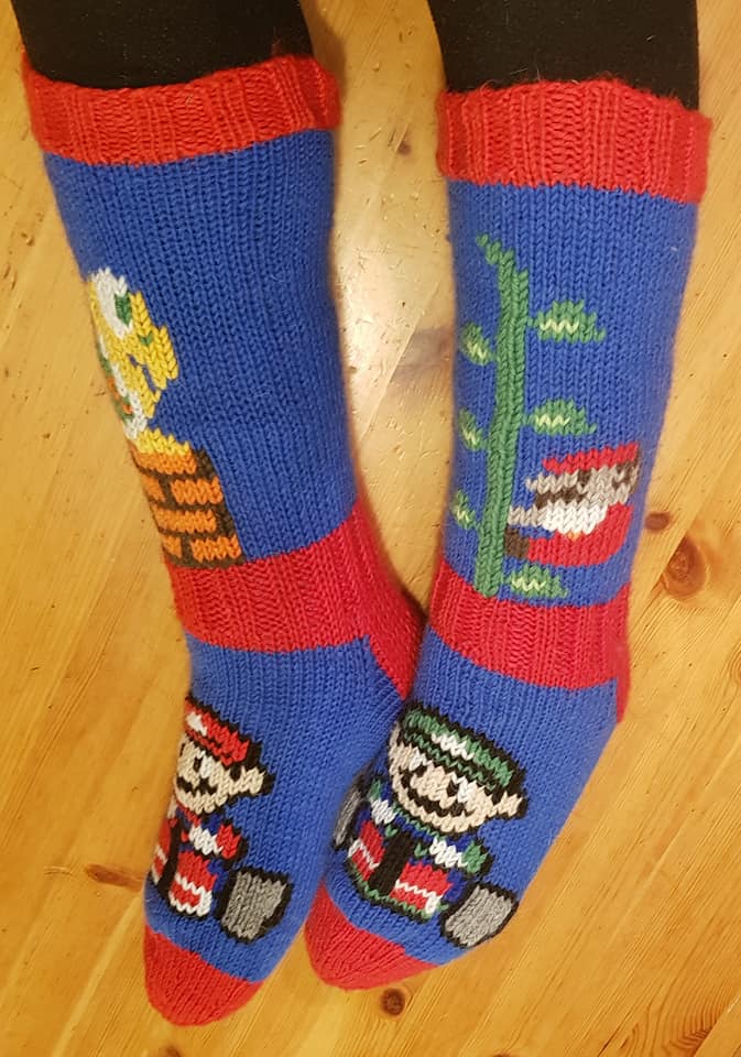 Pomppupelit, karttingit ja muut, menee! Näihin sukkiin yhdistyikin perinteisen Mario-pomppupelin ja sen Mario Kartin hahmoja.