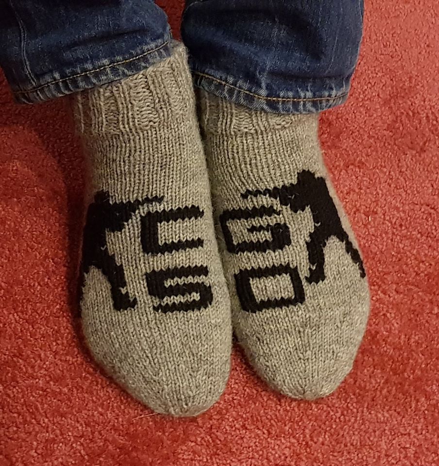 Sen jälkeen vuorossa on silmukointi, kuviot voi sommitellaa haluamallaan tavalla, itse siirsin tekstit kulkemaan sukkien ”sisäsivuilla”.