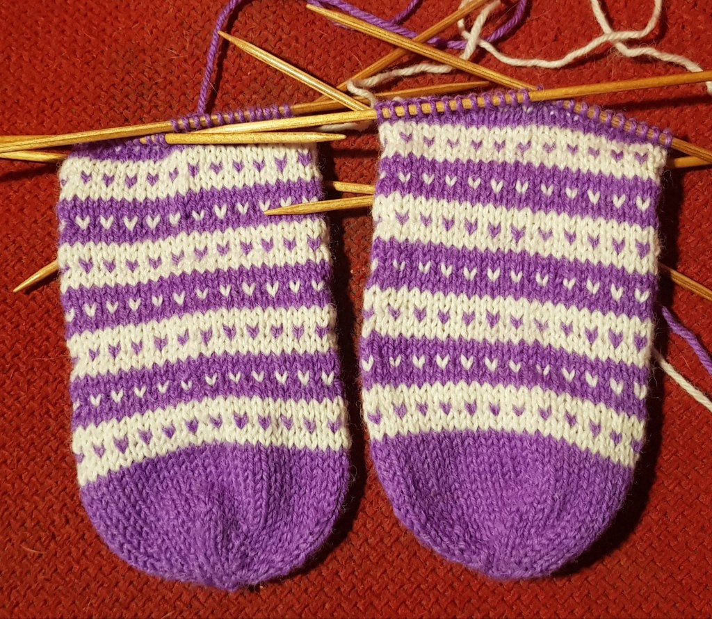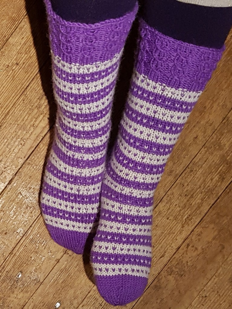Jalkapohjan raitoja kutoessa 1. puikolla aloitetaan kahdella mustalla silmukalla ja jatketaan puikko loppuun 2 mustaa-1 lila-2 mustaa jne. Puikko päättyy 2 mustan silmukan sarjaan. Jalkapöydän päällä oleva kuvio alkaa aina lilalla ja 3. puikon viimeinen silmukka on lila.
