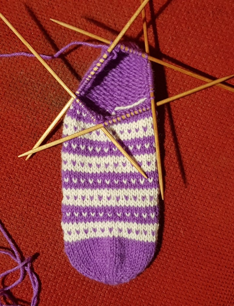 Nilkan kuvioinnin ekan sydänrivin jälkeen ryhdyin tekemään kantapäätä. Kantalapun tein 23 silmukalla vahvennettuna, korkeutta sille tuli 28 kerrosta. Kantalapun kavennukset jaoin 6-10-7 jonka jälkeen jatkoin kuviointia samalla kun tein kiilakavennukset ja se nyt ei ihan mennyt ihan nappiin.