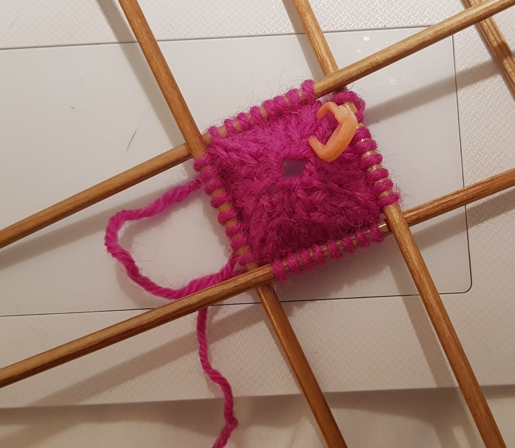 Lähde jakamaan silmukoita neljälle puikolle eli ota kolmas puikko käyttöön ja kudo 1 silmukka, kudo seuraava silmukka ensin takaa ja sitten edestä. Neljäs puikko käyttöön ja sama homma, kudo 1 silmukka ja seuraava ensin takaa ja sitten edestä. Ekan puikon neljä silmukkaa on nyt jaettuna kahdelle puikolle niin että kummallakin on 3 silmukkaa. Kudo vielä toisen puikon silmukat samoin eli kudo 1, kudo seuraava ensin takaa ja sitten edestä. Ota nyt viides puikkokin käyttöön ja tee sama vielä tähteenä oleville silmukoille. Nyt sinulla pitäisi olla neljällä puikolla 3 silmukkaa.