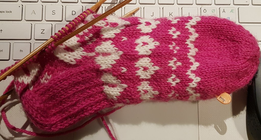 Kuten sanottua, varpaista aloittaessa kuvioinnin kohdistaminen oli hankalaa ainakin ekalla kerralla joten nyt puikoilla on vastaavat, jotka on vuorostaan aloitettu varresta. Niistä bloggaus sitten aikanaan.