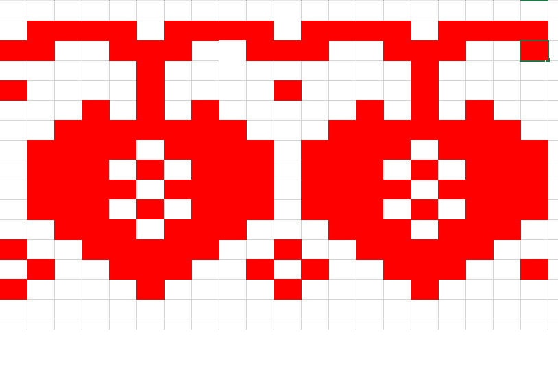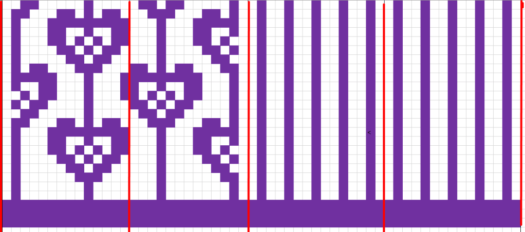Riittävän monen yrityksen jälkeen sain kuin sainkin kuviot osumaan, joten jatkoin kuviointia samalla kun tein kiilakavennuksia reunoihin. Kiilakavennukset tein joka toisella kerroksella ja kavensin kunnes silmukoita oli jäljellä 64.