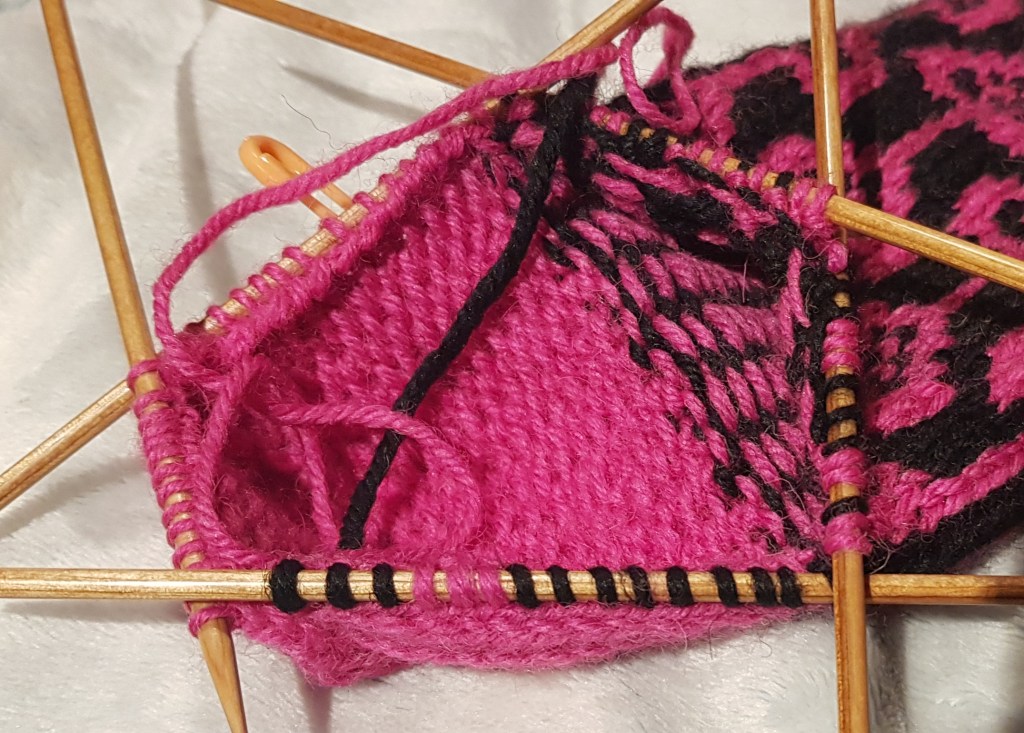 Päädyin tekemään mustalla vielä muutaman rivin enemmän ennen rajauskohtaa, eli ”sydämen” keskikohdan nauha kasvoikin 6 kerroksen korkuiseksi. Sen jälkeen tein kantapään mustalla 25 silmukalla ja kavennukset 6-12-7 jaolla.