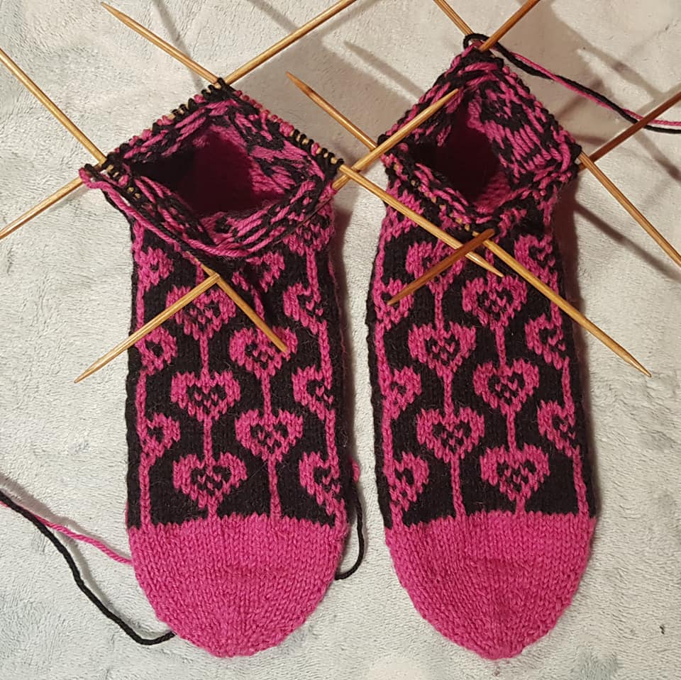 Kärjen jälkeen aloin tehdä kuviointeja sukkaan. Kärjestä kutoessa myös sydämen keskellä oleva silmukka muodostaa pienen sydämen. Jalkapöydän kuviointi, samoin kuin nilkan alueen, on 48 silmukalle.
