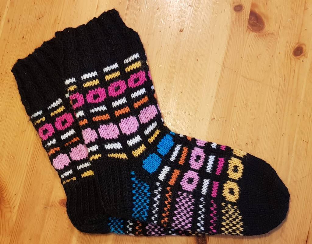 Nämä sukat on kokoa 39, kokoa saa todella helposti muokattua karkkirivejä vaihtelemalla. Koon 36 sukkiin on tupannut tulemaan neljä karkkiriviä jalkaterään, näissä niitä on viisi.