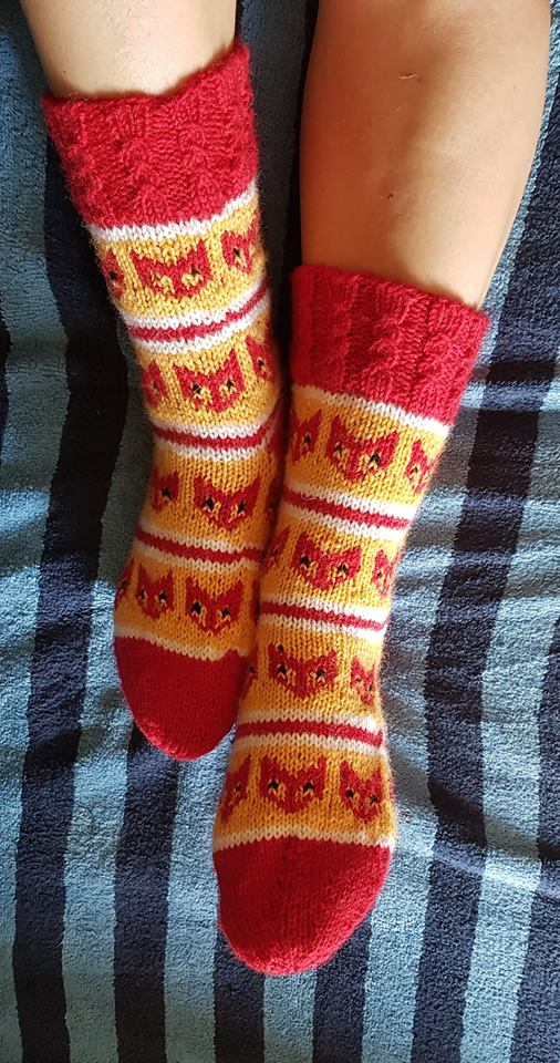 Silmät voi silmukoida myöhemmin, tai sitten kutoa samalla kun tekee kuviointia. Kuvionnin jälkeen tee sama määrä keltaisella kuin teit ennen kettukuviota ja vaihda valkoiseen. 2krs valkoisella, 2krs punaisella, 2krs valkoisella ja uudelleen keltainen palkki johon sijoitat ketut. Kahden kettukuviointipalkin jälkeen vaihda jälleen valkoiseen, tee sillä 2 krs ja vaihda punaiseen. Tee kantalappu ja -pohja punaisella ja poimi sillä vielä sivusilmukatkin. Aloita kiilakavennukset ja kudottuasi jalkateränkin puolelle 3 kerrosta punaisella vaihda jälleen valkoiseen. Tee kiilakavennuksia niin kauan kun silmukoita on jälleen 54, vaihda keltaiseen kahden valkoisen kerroksen jälkeen. Aloita ketut jälleen sen mukaan kuin teit varressakin eli joko 2,3 tai 4 keltaisen kerroksen jälkeen. Kettukuviointipalkin jälkeen vaihda aina valkoiseen, punaiseen ja taas valkoiseen ja tee uusi palkki. 36 koon sukkiin tulee itselläni kaksi kettukerrosta jalkaterään ja keltaista on jokaisen palkin alussa ja lopussa 2 kerrosta. Kun jalkaterän pituus on sopiva vaihda jälleen valkoiseen, halutessasi voit vaihtaa puikotkin 3,5mm tässä vaiheessa. Kavenna samalla jokaisella puikolla 1 silmukka pois. Kavenna vielä joka toisella puikolla 1 silmukka pois toisella valkoisella kerroksella. Vaihda lanka punaiseen ja aloita sädekavennukset. Viimeistele höyryttämällä.