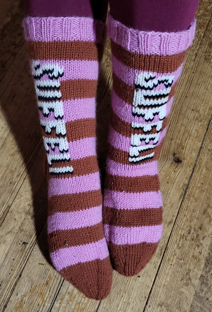 Tänään valmistui työkaverille luvatut enkkulakusukat. Näitä on todella kiva tehdä, sillä taajaan vaihtuvat langat saavat työn tuntumaan joutuisalta.