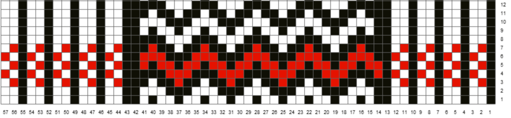 Alkuun loin 60 silmukkaa (70), jolla tein valepalmikkoa neljä mallikertaa. Neljännen mallikerran jälkeen tein nauhakujan kutomalla *3 o, langankierto, 2 o yhteen*. Tämän kerroksen jälkeen kudoin kerroksen oikeaa ja samalla lisäsin langannostosta neljä (2) silmukkaa jakaen ne jokaiselle puikolle 60 -> 64 (70 -> 72). Kudoin vielä muutaman kerroksen lilalla, jonka jälkeen aloitin kaavio I kutomisen riviltä 2.