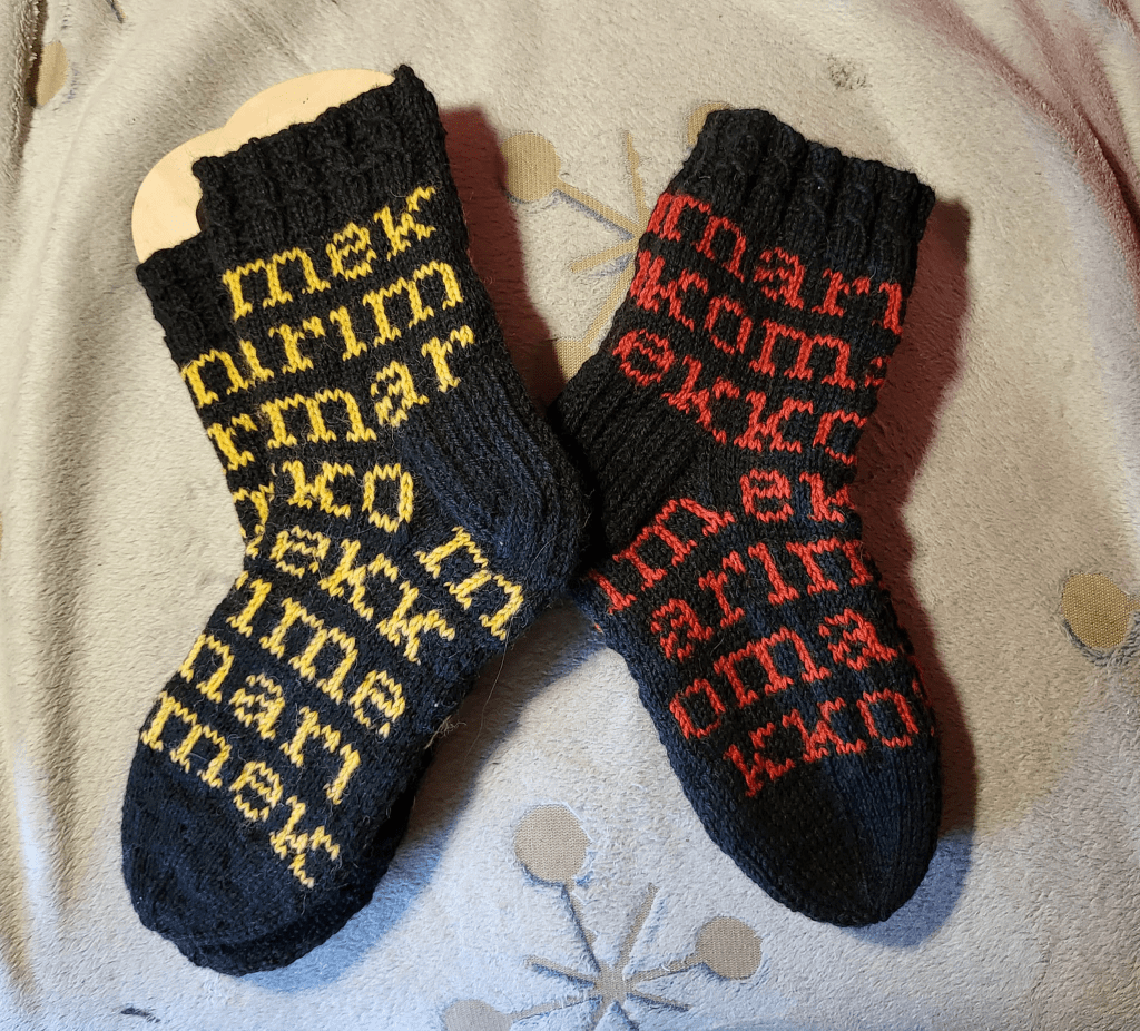 Mahdottomaksi on touhu mennyt näiden lankakerän loppujen kanssa ja mahdottomaksi se on mennyt myös näiden Marimekko-sukkien kanssa. Sen verran monet näitä on nyt tullut tehtyä, että hupsista hei, kaavio alkaa olla syöpyneenä muistiin. Niinpä tänäänkin tuli linja-automatkalla kudottua toinen sukka kärkikavennuksia lukuunottamatta valmiiksi, toisen parin olinkin saanut jo aamusella pääteltyä.