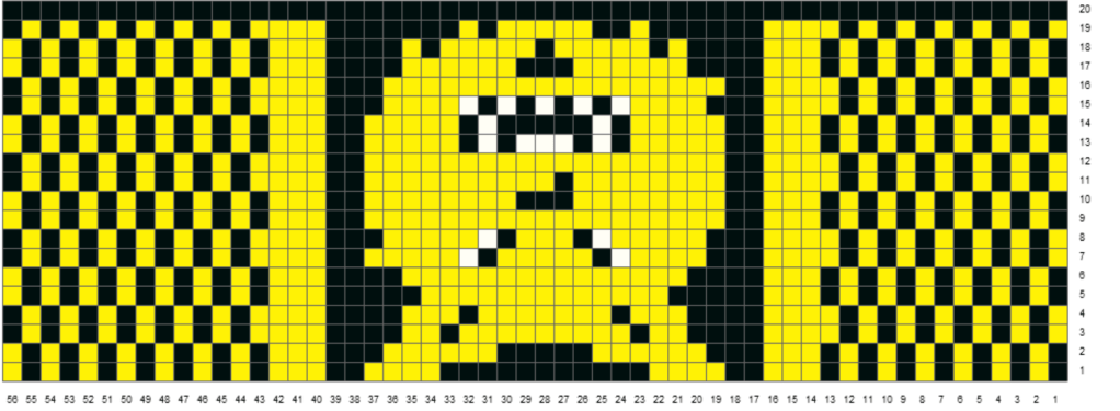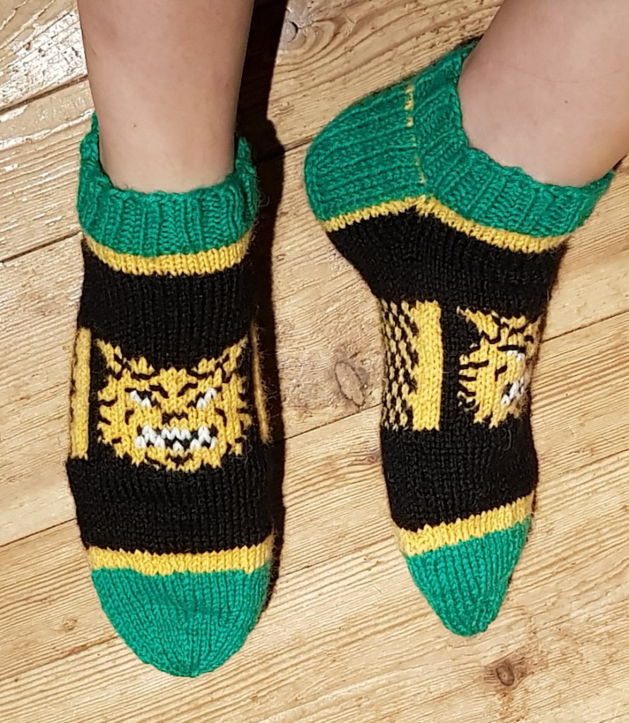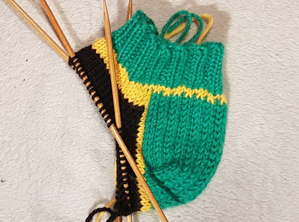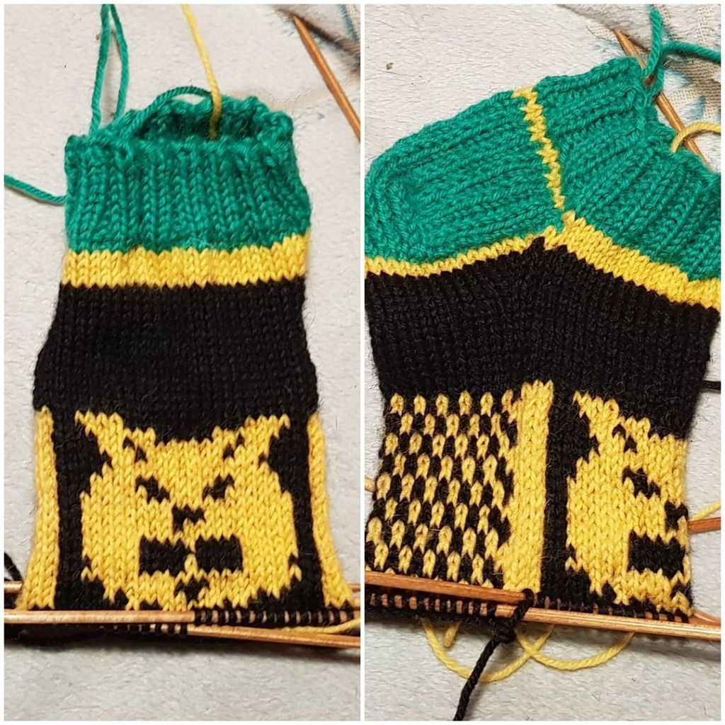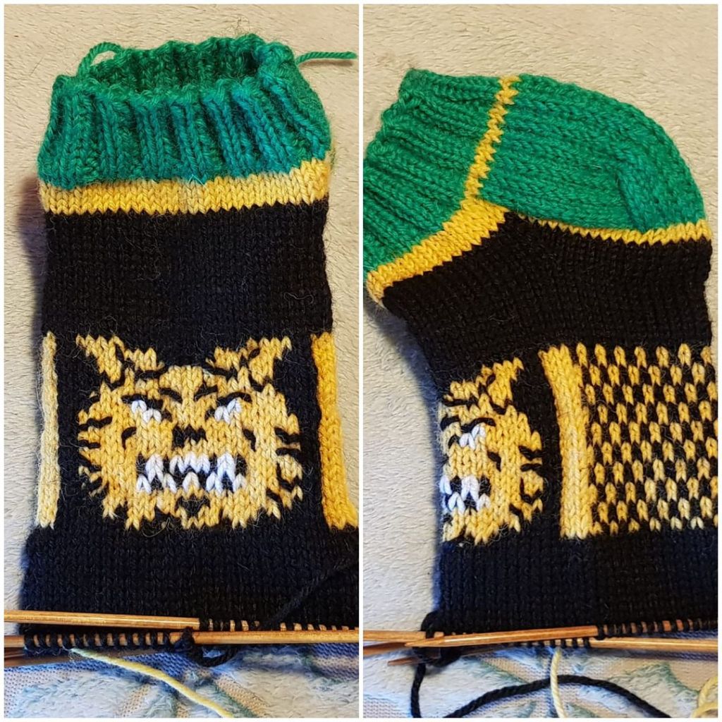 Poimin kantalapun kummastakin sivusta 14 silmukkaa ja kantapohjan kavennusten valmistuttua otin jälleen mukaan keltaisen langan ja ryhdyin kutomaan mallikertaa tehden samalla kiilakavennukset joka kerroksella kunnes jäljellä oli jälleen 56 silmukkaa.