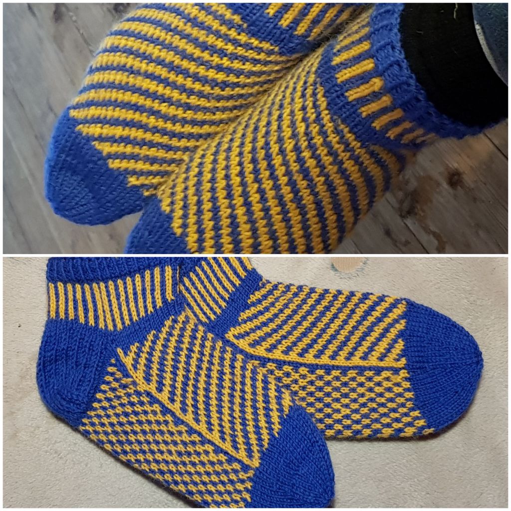 Kun jalkapohjan pituus oli n. 5 senttiä alle lopullisen pituuden jätin keltaisen langan pois ja kudoin kerroksen pelkällä sinisellä ennen kuin aloitin kärkikavennukset. Kärkeen tein jälleen sädekavennuksen. Lopuksi höyrytys ja blokeille kuivumaan. Nämä jos jotkut oli nopeat tehdä!