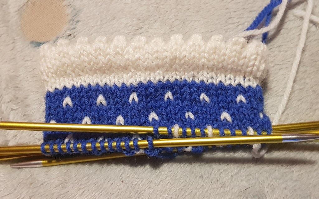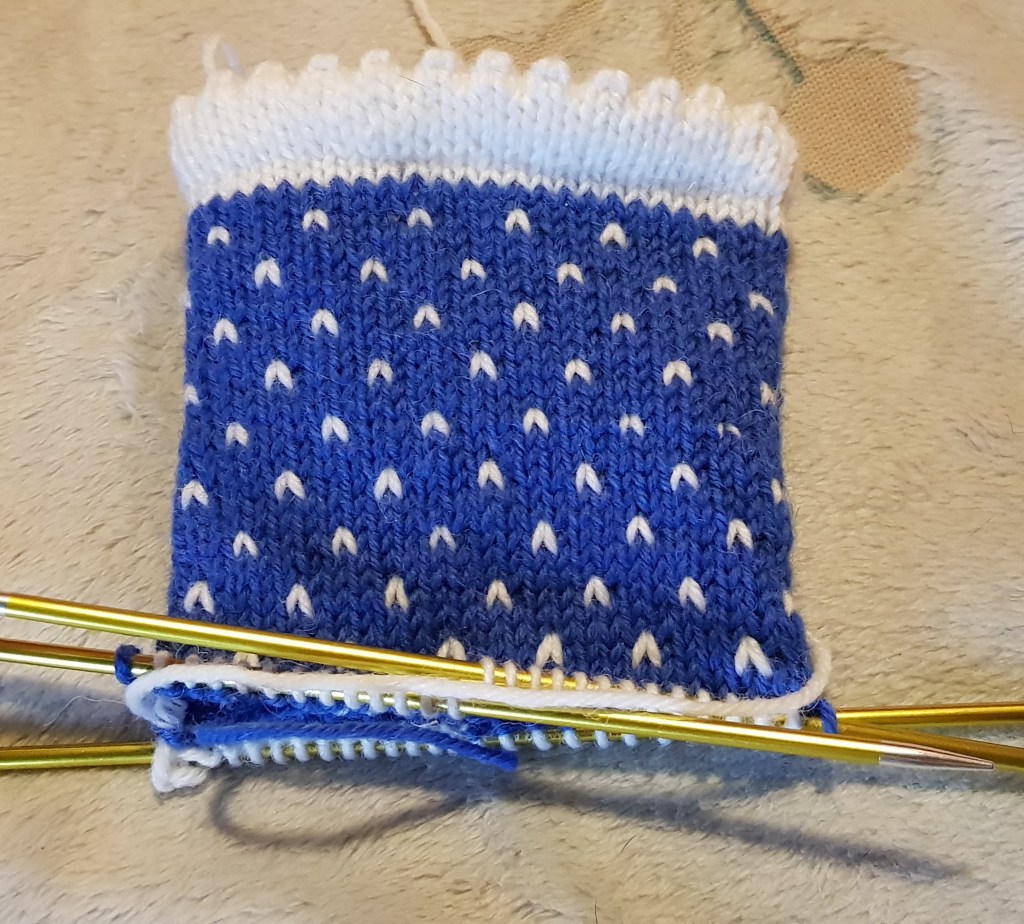 Välillä ideat on kateissa, mutta lankoja riittää. Niinpä päädyin luomaan 7-veljestä langasta 52 silmukkaa, kutomaan 5 kerrosta oikeaa, kerroksen langankierto-2 s oikein yhteen-langankierto jne kerroksen läpi. Viisi kerrosta lisää oikeaa ja sen jälkeen yhdistin reunat Hääräämön mallin mukaisesti yhteen ja kas, nirkkoreunahan siinä.