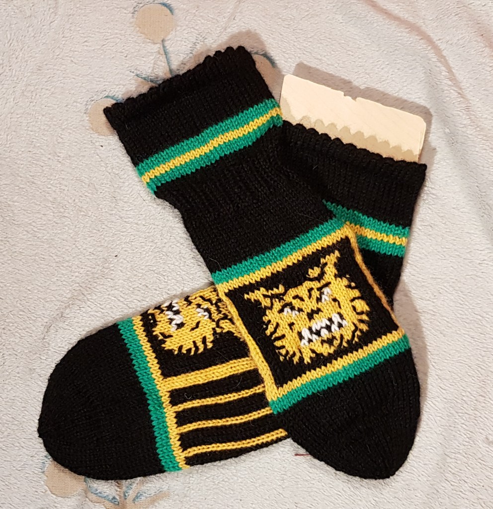 Reunan valmistuttua lisäsin jokaiselle puikolle yhden silmukan 52 -> 56. Kudoin mustalla langalla kymmenen kerrosta, vihreällä kolme, keltaisella kaksi ja vielä kolme vihreällä kunnes vaihdoin takaisin mustaan. Viisi kerrosta oikeaa, jonka jälkeen 2o, 2n-joustinta kymmenen kerrosta.