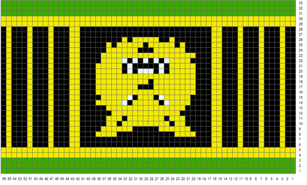 Kiilakavennusten valmistuttua otin mukaan vihreän langan ja kudoin kolme kerrosta vihreällä mallikaavion mukaan. Sen jälkeen otin mukaan keltaisen ja lähdin kutomaan mallikaaviota riviltä 4 eteenpäin. Loppuun jälleen kolme kerrosta vihreällä.