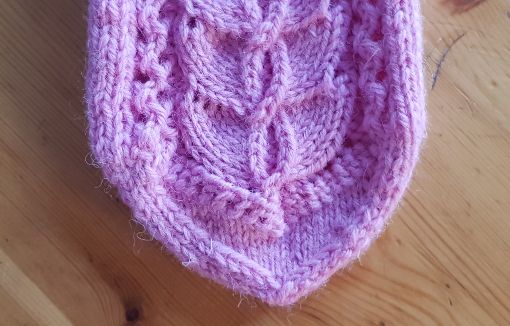 Kärkiosassa kudoin päällipuolen kuviointia niin pitkälle kuin pystyin, viimeisen kuviokerran päätin niin, että tein aina kolme nurjaa kumpaankin sivuun jolloin keskikuvio ”nousee” ylös pohjastaan. Loppuun tein leveän nauhakavennuksen ohjeen mukaan.