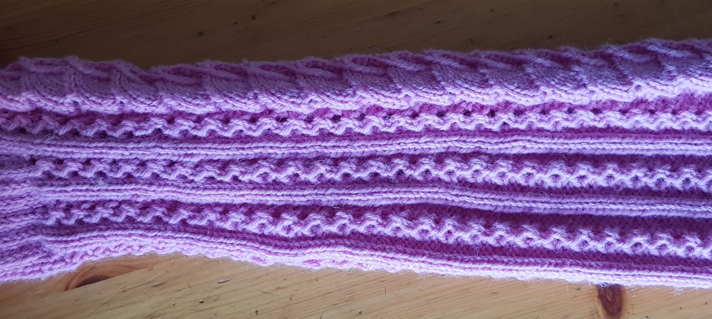 Koska näistä haluttiin todella pitkät ja lanka on täysin eri, niin päädyin tekemään varteen lisäkavennuksia. Kun olin tehnyt kaikissa raidoissa kavennuksen kertaalleen teinkin vielä kaikissa raidoissa keskikuvion sivuja lukuunottamatta yhdet.