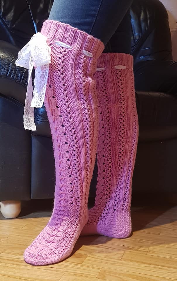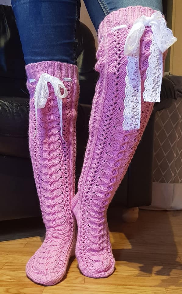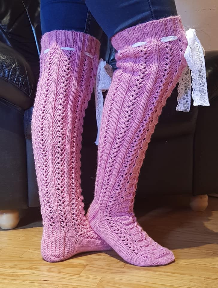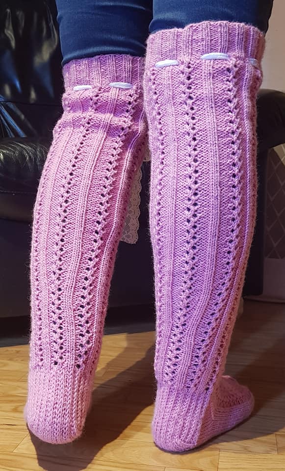 Näiden sukkien lopulliset koot ovat ystävälle juuri passelit. Pituutta varrelle tuli joustimineen päivineen nilkasta ylöspäin 44 cm, joten toivottavasti nämä nousevat polven yläpuolelle jolloin joustinpitsi varren yläosassa asettuu polvitaipeen kohdalle.