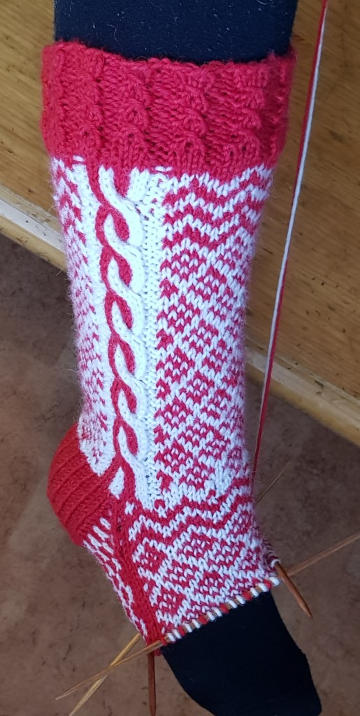 Palkkien jälkeen kudoin 4 kerrosta valkoisella, jonka jälkeen aloitetin lakupekkakuvioinnin. Lakupekkojen suut jätin kutomatta, ne silmukoin punaisella sukkien valmistuttua. Kuvio on 16 silmukalla jaollinen, lakupekkaan menee 15 silmukkaa ja jokaisen lakupekan väliin jää yksi valkoinen silmukka.