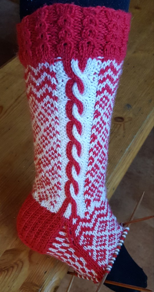 Punaisen raidan jälkeen tein vielä kerroksen pelkällä valkoisella niin, että lähdin siitä tekemään kantalappua. Kantalapun ja sen kavennusten valmistuttua lähdin kutomaan uudelleen kaavion kerroksia 2-11 tehden samalla kiilakavennuksia kantapäässä. Kantapään kavennuksia jatkoin niin kauan, että lopullinen silmukkamäärä oli 56.