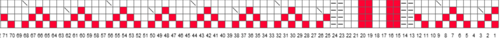 HUOM! Jos teet palmikon kahdesti eli toistat mallikerran kahteen kertaan, lisää silmukoita kaksi! Jos teet mallikerran kokonaisuudessaan vain kerran, niin toista mallikerran silmukoita 2-7 silmukoiden 36 ja 1 välialueella kuusi kertaa. Kuva ohjeen lopussa.