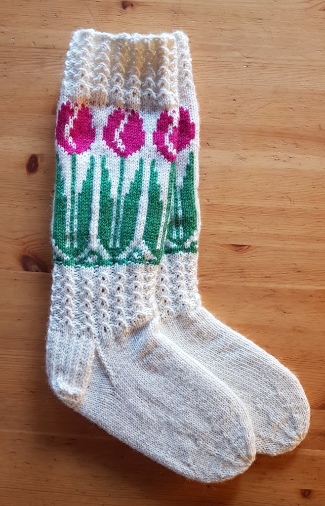 Tulppaani jos joku saa aina mielen tulevaan kesään. Eipä siis ihme, että tulppaaneilla on oma vannoutunut fanikuntansa ja yksi fanikunnan jäsenistä kysäisi ihan ohimennen voisinko tehdä hänelle tulppaanisukat. Jaa-a. Enpä olekaan sellaisia ennen tehnyt mutta tutkitaan tilannetta.