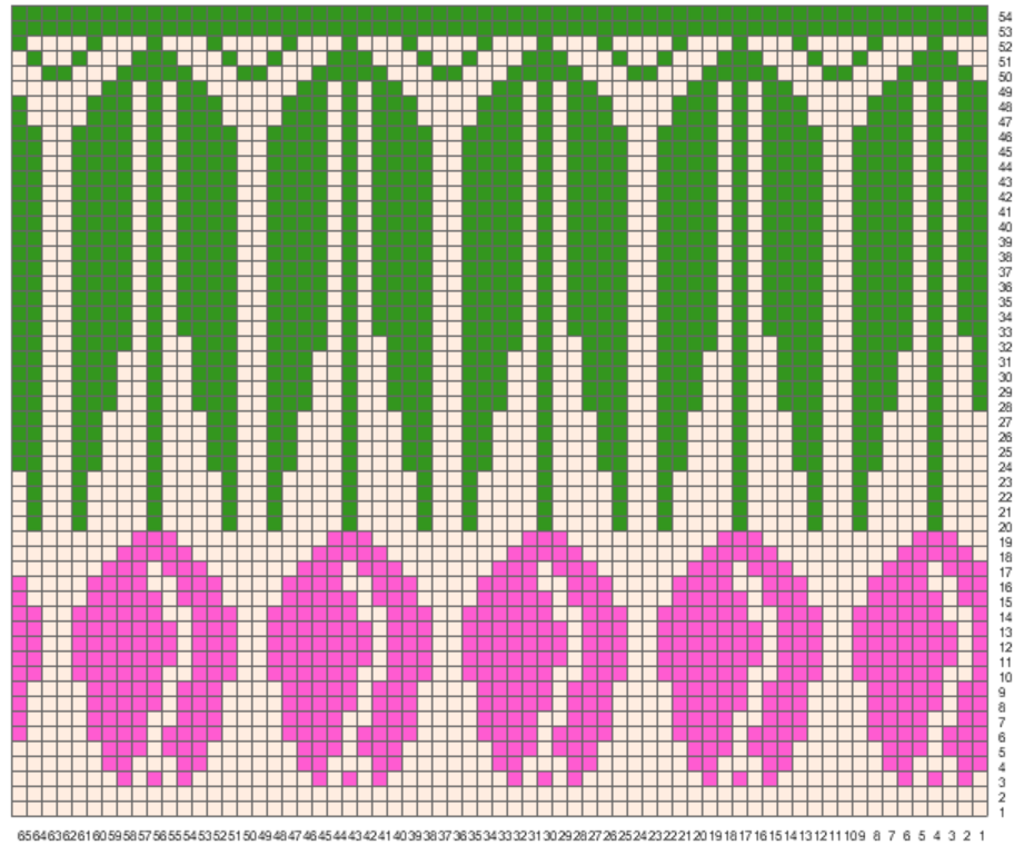 Erinäinen määrä Pinterestin tutkailua, kokeiluja piirtäen knitbirdiin, lisää tutkailua, lisää piirtämistä ja kas. Lopulta sain kuin sainkin näytölle kukkia, jotka omasta mielestäni olivat tulppaaneita. Ennätin siinä aika pitkän matkaa kutoakin vartta, mutta kappas miten kävikään.En sitten enää YHTÄÄN pitänyt kukista joita varteen ilmestyi…