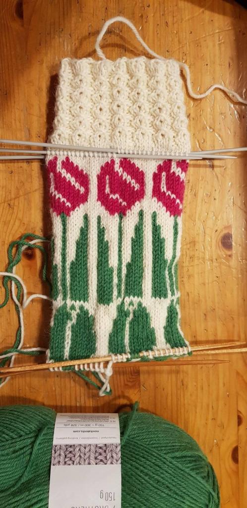 Aloitukseen loin 70 silmukkaa ja kudoin 5 sarjaa lyhyttä valepalmikkoa (vain 3 välikerrosta). Valepalmikon jälkeen kavensin pois 5 silmukkaa ja lähdin kutomaan tulppaanikuviota varteen.