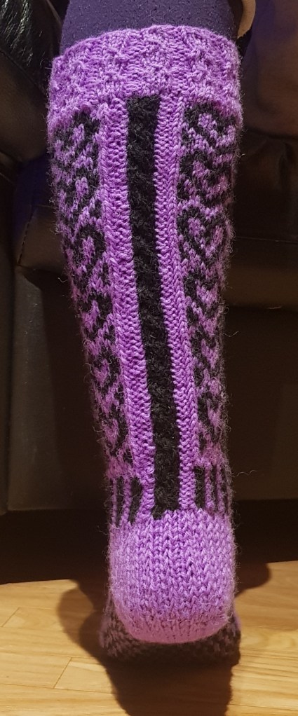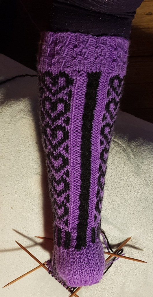 Joustimen tehtyäni lähdin kutomaan mallikaavio kakkosta edessä ja takana puolestaan tein mallikaaviota kolme. Muuten mallikaaviot on hyvin samat kuin Kevään korvalla-sukissa, mutta lisäsin nurjia silmukoita kuvioalueiden reunoihin.