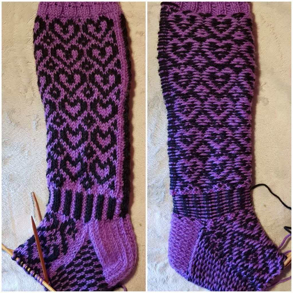 Päätinpä siinä lennossa tehdä toiseen sukkaan sydänosan kääntymään vastakkaiseen suuntaan, tokihan ne voi tehdä samansuuntaisesti molemmat. Alla niin, että sydänkuvion keskikohta kääntyykin sukankäyttäjän suunnasta oikealle.