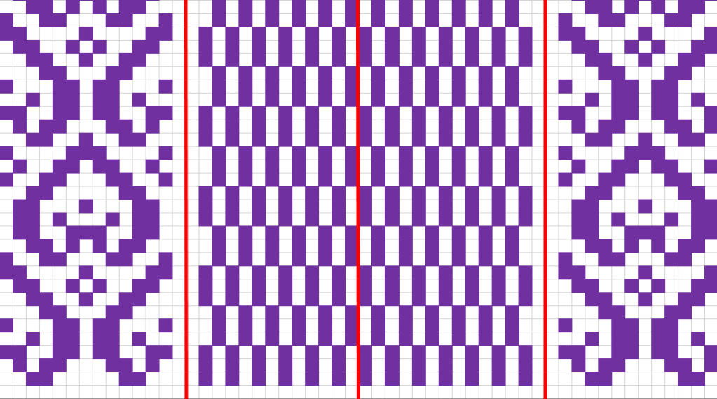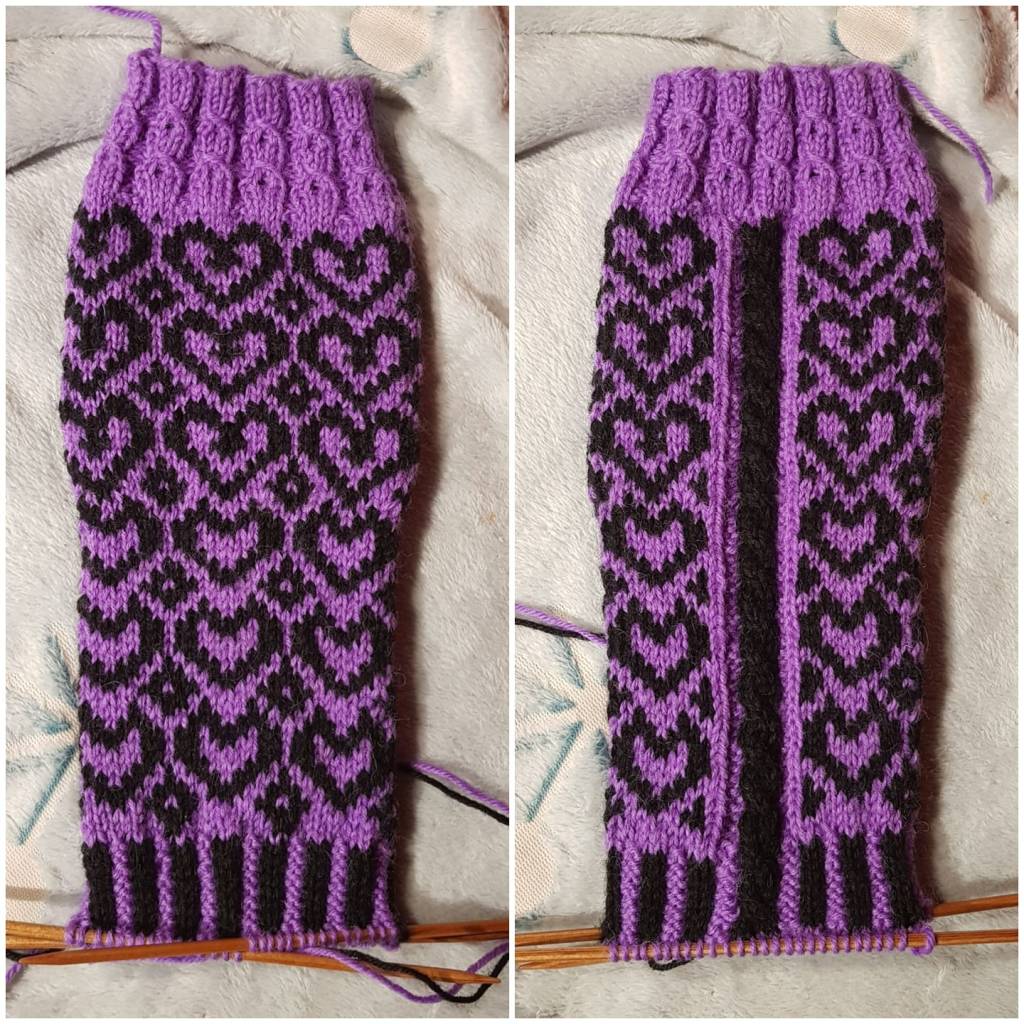 Koska näistä haluttiin todella pitkät ja lanka on täysin eri, niin päädyin tekemään varteen lisäkavennuksia. Kun olin tehnyt kaikissa raidoissa kavennuksen kertaalleen teinkin vielä kaikissa raidoissa keskikuvion sivuja lukuunottamatta yhdet.