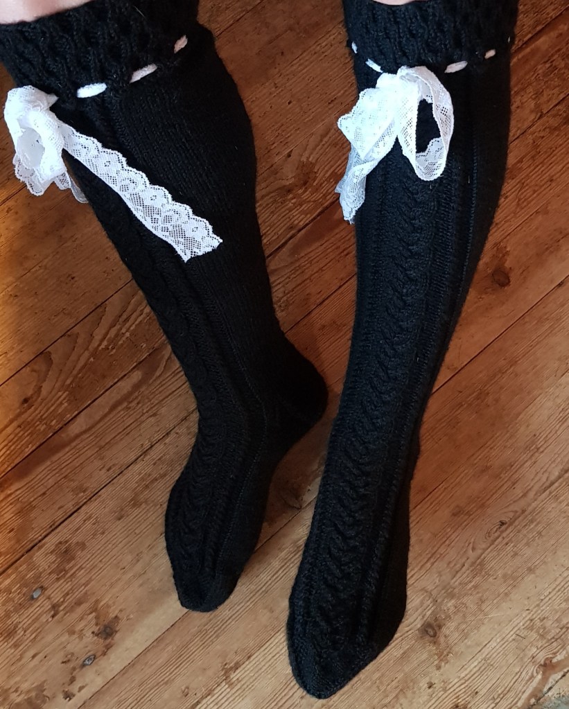 Sukkien koko on 39-40 ja varrella on pituutta 37 senttiä. Lankana näissä on 7-veljestä luonnonvalkoinen ja sukkapariin sitä kului yhteensä n. 250 grammaa.Homman viimeisteli musta joustopitsi sukkien suissa.