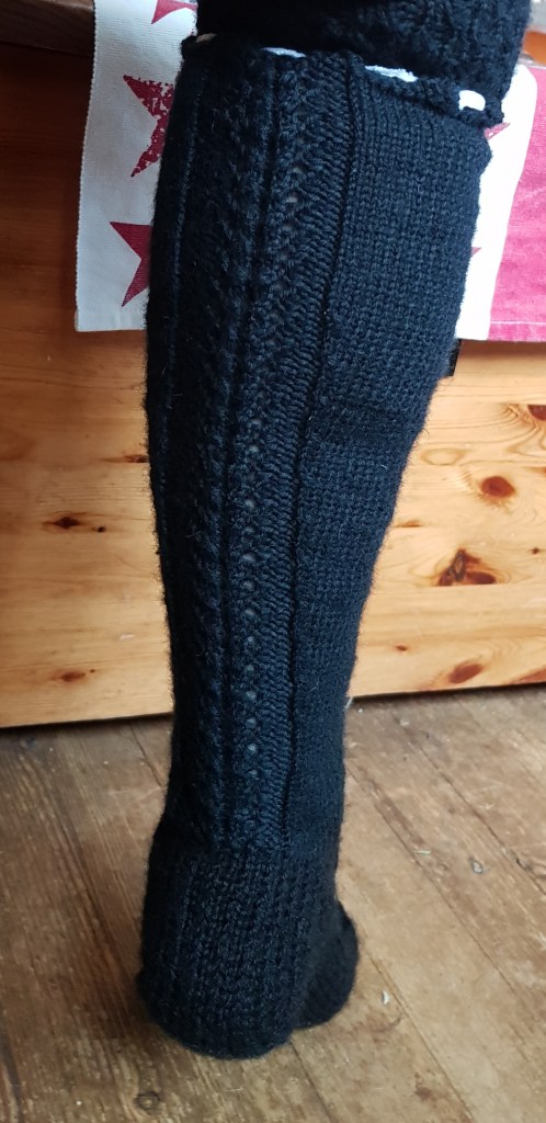 Näiden sukkien lopulliset koot ovat ystävälle juuri passelit. Pituutta varrelle tuli joustimineen päivineen nilkasta ylöspäin 44 cm, joten toivottavasti nämä nousevat polven yläpuolelle jolloin joustinpitsi varren yläosassa asettuu polvitaipeen kohdalle.