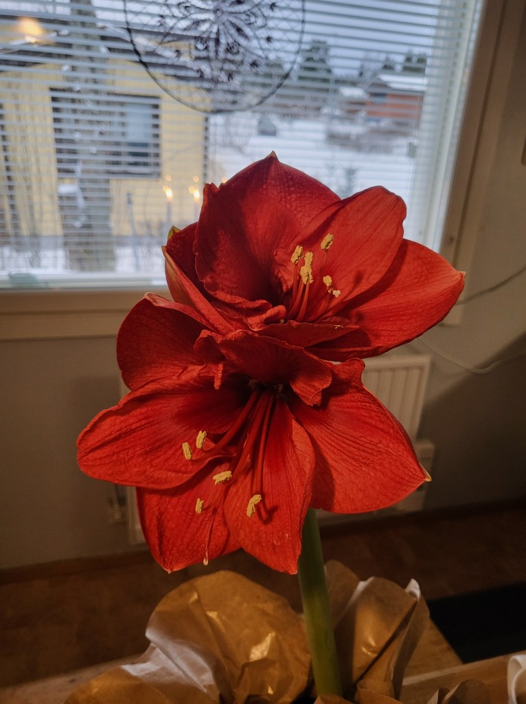 Amaryllis oli availlut kukkiaan vielä lisää päivän aikana ja kyllähän siitä on tulossa aikas mahtavan kokoinen. Olkkarissa oleva versio ei ole edelleenkään osoittanut minkäänlaista ajatustakaan nuppunsa avaamisesta, mutta pullistumista on kyllä jatkettu ja huolella onkin. Samalla kertaa se on venäyttänyt vartensa vallan komeaksi, oletan silti, että se pysyy pystyssä ihan hyvin.