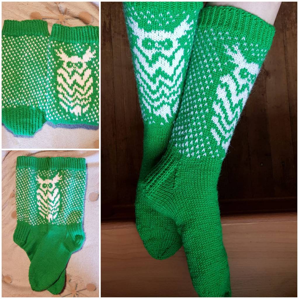 Niinhän siinä kävi, että kun joku malli vie mukanaan niin se vain vie. Jos kohta ensimmäiset kiukkupöllöt oli omaan silmään juuri eikä melkein, niin pakko niistä oli tehdä vielä vähän isommille jaloillekin passelit. Niinpä piirsin kaavion, jossa kuvioinnit tehdään 69 silmukalla ja kavennetaan jo varren kuvioinnin alaosassa muutama silmukka pois.