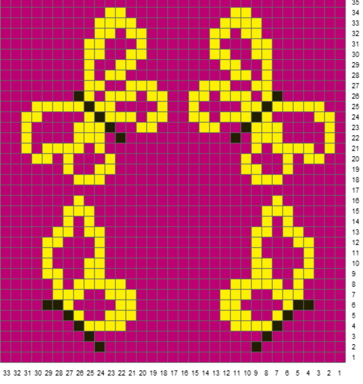 Varren valmistuttua tein silmukoinnit, ensin aioin jättää pinkit rajaukset pois mutta jotenkin ne sopi niin hyvin, että päätin ne kuitenkin tehdä. Lisäsin ne sitten samalla neulemallikaavioonkin. Jos et niitä halua, niin käytä pelkästään keltaisia alueita kuvioista.