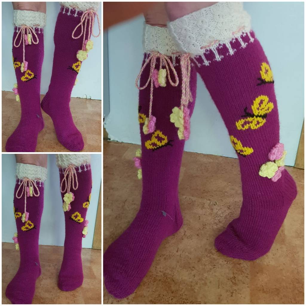 Olihan siinä silmukoitavaa, mutta hauskat tuli! Näiden varsinainen sukkaosa on tehty Hoitsukat-sukkien silmukkamäärillä ja kavennuksilla, malli kuvaan löytyi Pinterestistä. Seiskaveikasta.