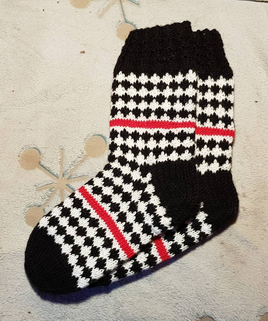 Aloitukseen loin 60 silmukkaa ja tein niillä valepalmikkojoustinta pätkän. Lisäsin joustimen jälkeen 4 silmukkaa ja otin mukaan mustan langan tehden sillä tikapuusilmukat joka neljännen silmukan jälkeen. Varsien kuvioinnit tuli sukkiin peilikuvina, joten lähdin kutomaan neulekaavioiden mukaisia kuvioita varsiin.