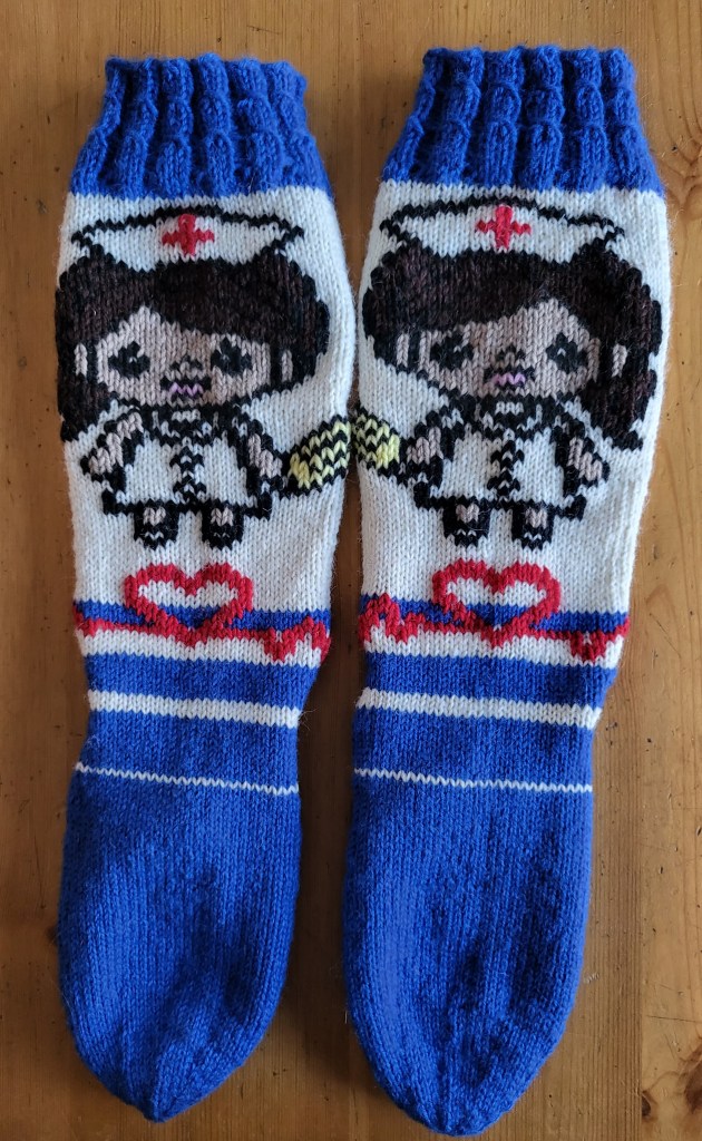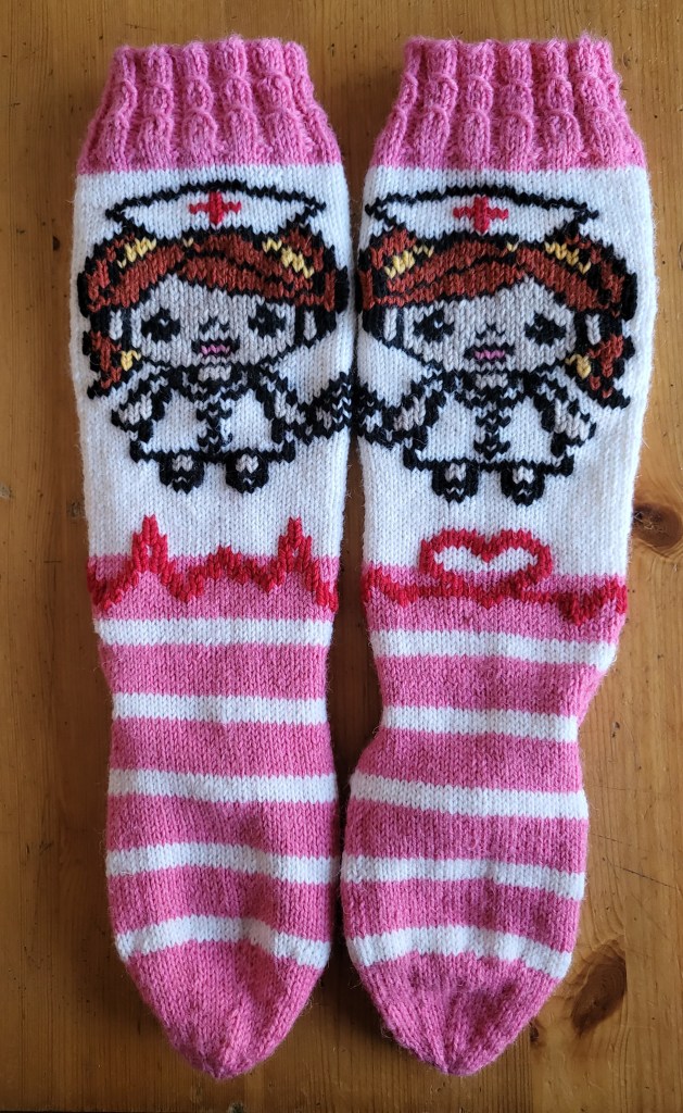 Hoitajan neulekaavion löytää mm. Pinterestistä, samoin sydänkäyrän kaavion joten niitä en tänne jaa. Sen verran nyt kuitenkin tietoa sukista, että ne on kudottu seiskaveikasta, aloituksessa oli 65 silmukkaa ja valepalmikon valmistuttua kavensin yhden silmukan pois.
