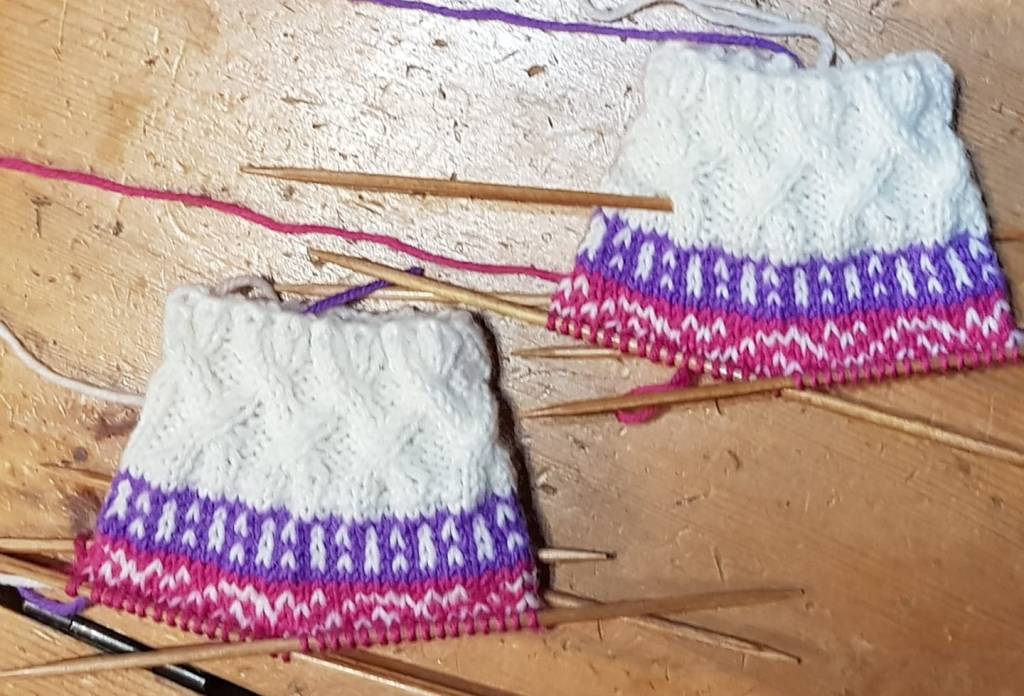 Sen jälkeen vuorossa on silmukointi, kuviot voi sommitellaa haluamallaan tavalla, itse siirsin tekstit kulkemaan sukkien ”sisäsivuilla”.